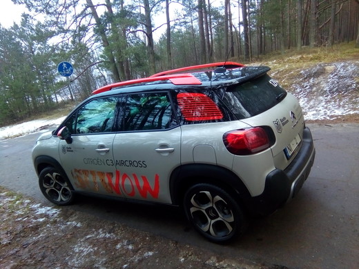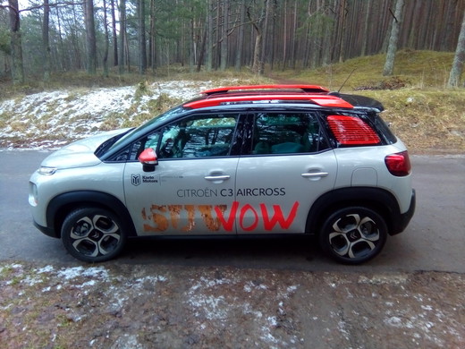 Testa braucienā devāmies ar auto, kura pilnais nosaukums ir “Citroen C3 Aircross 1.2 PureTech 110 6AT”. Tehniskie raksturlielumi: motora jauda 110 Zs pie 5500 apgriezieniem, grieze 205 Nm pie 1500 apgriezieniem, kombinācija ar automātisko sešpakāpju pārnesumkārbu nodrošina paātrinājumu 0-100 km/h 11,8 sekundēs. Vidējais ražotāja norādītais degvielas patēriņš 5.5 l/100km.
