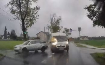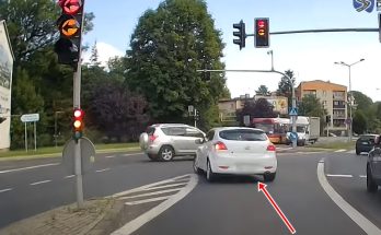 Baltā automobiļa vadītājs startē no luksofora, kad vēl deg sarkanais signāls un liek citiem satiksmes dalībniekiem strauji bremzēt.