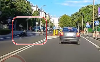 Iespējams, saules apžilbināts motobraucējs notriec meiteni uz gājēju pārejas, krītot arī pats.