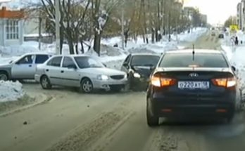 Augstie sniega vaļņi un automobilis, kas veic pagriezienu un piestāj šaurās ielas dēļ aizsedzot skatu, “piespiež” izbraucošā auto vadītāju kļūdīties.