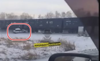 Video redzams kā kravas vilciena sastāvs braucot lielā ātrumā aizvelk sev līdzi vieglo auto, kas ieķēries starp vagoniem.