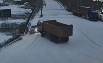 Kravas auto šoferis nav gatavs tam, ka ceļs krustojumā būs tik slidens un, lai arī vieglās automašīnas vadītājs cenšas piespiesties pie malas, cik spēj, sadursme tomēr notiek.