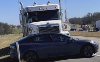 ASV kravas auto aizķēris Tesla Model 3 un ar ātrumu 100 km/h stūmis sev pa priekšu šķērsām sagriezto elektromobili aptuveni kilometru.