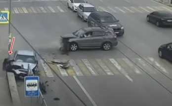 Veicot kreiso pagriezienu, krosovera vadītājs nepalaiž Hyundai, kas trieciena rezultātā novirzās no kursa un gandrīz sabrauc divus gājējus.