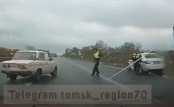 Policijas darbinieki netālu no Tomskas (Krievija) mēģina apstādināt VAZ, taču vadītājs, kura automašīnā uzstādīts video reģistrators, ir neuzmanīgs un pagriež stūri nepareizā virzienā.