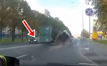 Tikai mirkli pēc tam, kad vieglais auto izmainās ar pretimbraucošo atkritumu vedēju, smagsvars ar visu kravu iegāžas pretējā joslā.
