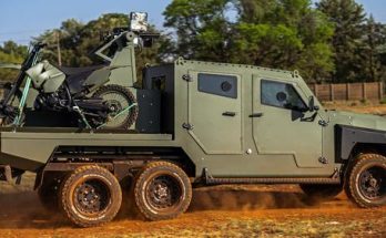Africa Aerospace and Defence Show (AAD2022) Dienvidāfrikā tiek demonstrēts sešriteņu bruņu pikaps ar dronu aizsardzību.