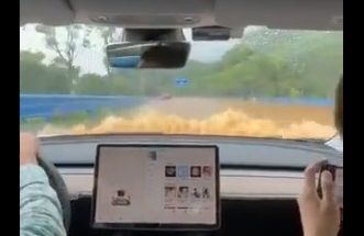 Izskatās, ka elektromobilis ir viens no drošākajiem transportlīdzekļiem, ja runa ir par braukšanu pa dziļu ūdeni un cietu pamatu.