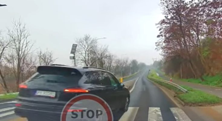 Video autors un pretimbraucošais auto apstājas, lai palaistu gājēju, bet Porsche vadītājs dodas tālāk apbraucot filmētāju pa “drošības saliņu”.