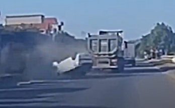 Pārkārtojoties, kravas auto šoferis aizķer vieglo automašīnu, kas ietriecas apmalē un apgāžas uz jumta.