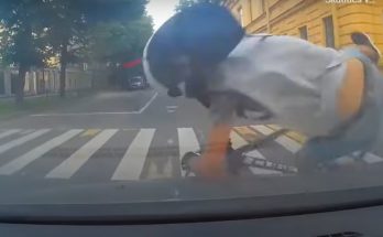 Pagriežoties pa kreisi autovadītājs saduras ar velosipēdistu, kurš uzkrīt uz motora pārsega.