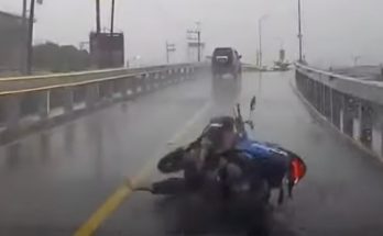 Peļķe, kurā iebrauc motorollera vadītājs izrādās pārāk dziļa – viņš krīt un tikai aizmugurē braucošā veiklā reakcija glābj puiša dzīvību.