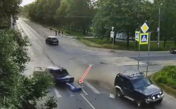 Pēc sadursmes žigulīša stūrētājs attopas uz ielas, mirkli vēlāk izkāpj arī pasažiere.