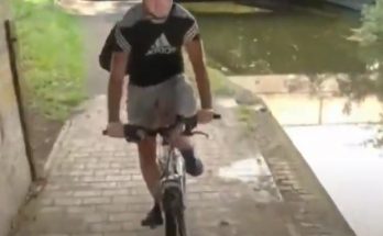 Divi velosipēdisti satiekas šaurā vietā zem tilta un viens no viņiem spiests izbaudīt peldi kanāla ūdenī.
