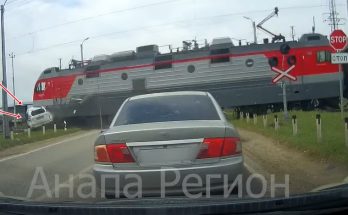 Toyota Land Cruiser vadītājs apsteidz visus, kas gaida pie dzelzceļa pārbrauktuves, taču tieši tajā brīdī tur parādās vilciens.