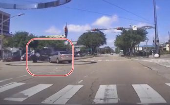 Vieglais auto iebrauc krustojumā pie sarkanās gaismas un izraisa sadursmi ar pikapu, apgāžot to uz sāniem.