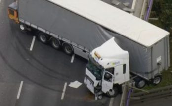Lielbritānijā kravas automašīna ar piekabi iztriecas cauri ceļa pārvada margām un iestrēgst, paliekot karāties virs šosejas A2,