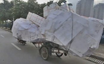 Vjetnamā šādi nopakots motocikls ar piekabi aizved tikpat daudz, cik neliels kravas auto.