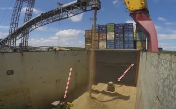 Paātrinātajā video redzams kā ar šķeldu piepilda lielu sauskravas kuģi. Interesanti, ka procesā tiek iesaistīti arī divi buldozeri.