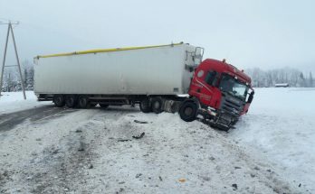 Bīstami braukšanas apstākļi saglabājas arī pie mums. Foto redzamais kravas vilcējs “salocījies” un ieslīdējis grāvī, kamēr uz ceļa palikusī puspiekabe pilnībā bloķējusi ceļu.
