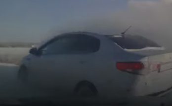 Pretimbraucošais autovadītājs izvēlas nobraukt no ceļa, lai izvairītos no vadību zaudējušā filmētāja auto.