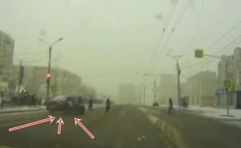 Uz slidenā ceļa vadību zaudējušais automobilis izslīd cauri cilvēkiem tos neskarot, tāpat nenodarot neko sliktu arī nākamajai cilvēku grupiņai, kas stāv pie pieturas.