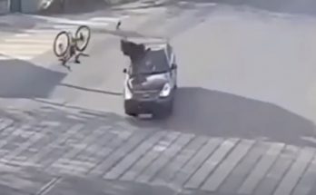 Velosipēdists šķērso krustojumu un tiek notriekts ar kādas jaunas sievietes vadītu automašīnu.