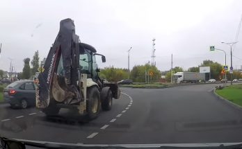 Izbraucot no satiksmes apļa, vieglais auto aizķeras aiz ekskavatora kausa.