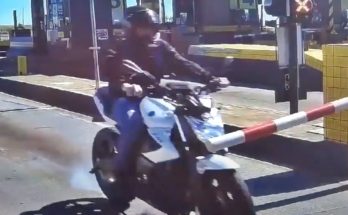 Motociklists cenšas izbraukt cauri maksas terminālim, izmantojot brīdi, kamēr barjera vēl nav nolaidusies pēc kravas auto, taču sistēma strādā veiklāk nekā viņš bija domājis.