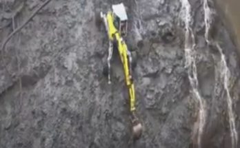 Speciāli konstruēts ekskavators Šveices kalnos pieveic teju vertikālu sienu.