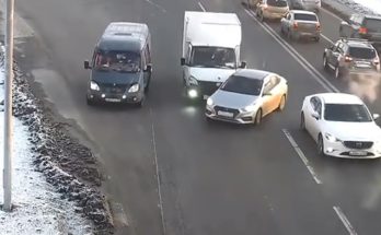 Huyndai vadītājs pārkārtojas neskatoties spoguļos, kas noved pie sadursmes ar kravas furgonu.