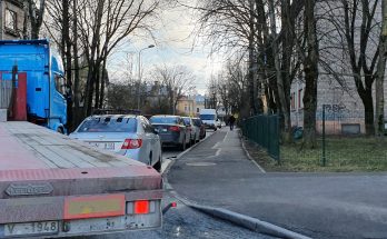 Kravas auto ar puspiekabi nevar nogriezties no Kalnciema ielas Rīgā, jo ceļu tam aizšķērso ielas malā stāvošs vieglais automobilis.