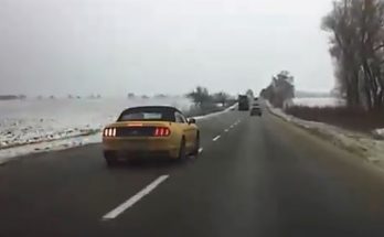 Ford Mustang vadītājs ignorē ziemīgos braukšanas apstākļus, nesavalda savu auto un nolido no ceļa.