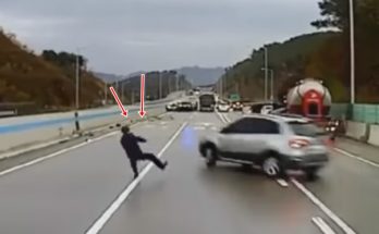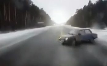 Kāds cilvēks, kas, visticamāk, izkāpis no savas avarējušās mašīnas, dažās sekundēs izvairās vismaz no četriem citiem spēkratiem, kas kļuvuši nevadāmi “melnā ledus” dēļ.