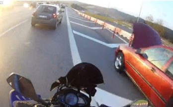 Motobraucējs apsteidz visus pa labo pusi, taču brauciens apraujas, kad viens no autovadītājiem nolemj apstāties.