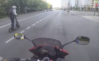 Motociklists ir pārsteigts, sastopot elektrisko skrejriteni, kas var sasniegt 100 km/h. Viņš aprunājas ar tā īpašnieku un pamēģina izbraukt.