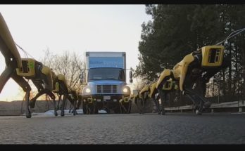 Kompānijas BostonDynamics izstrādātais Spotpower (SP) daudzfunkcionālais robots noder dažādiem darbiem. Lai pavilktu šāda izmēra kravas auto nepieciešami 10 “robotsuņi”.