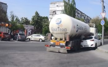Vieglais automobilis iebrauc kravas auto aklajā zonā un tiek piespiests pie apmales (no 1:00).
