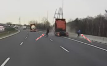 Pat ne veikli, bet zibenīgi – divi cilvēki neticamā veidā izglābjas mirklī, kad nezināmu iemeslu dēļ kravas vilcējs uz ātrgaitas šosejas Polijā novirzās no kursa un sadragā viņu furgoniņu, kas ar ieslēgtām brīdinājuma gaismām stāv uz nomales.