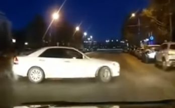 Video autors ietriecas durvīs vadītājam, kas izbraucot no sānielas saslīd un paliek ceļā filmētājam.