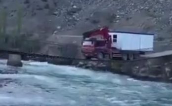 Kravas auto šķērso upi pa acīmredzami nedrošu pagaidu konstrukciju, kas izveidota kādreizējā tilta vietā