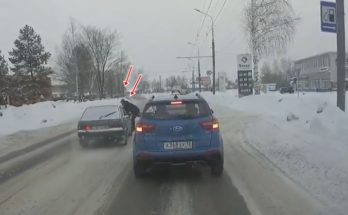 Automobilis apstājas, lai palaistu gājēju, kas vēlas pāriet ielu vietā, kur nav gājēju pārejas, taču otrā joslā braucošie nav tam gatavi (no 1:28)