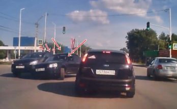 Vadītājs, kas, pēdējā mirklī iebrauc krustojumā no labās puses, nepaspēj pabeigt manevru un saduras ar mašīnām, kas brauc filmētājam pretējā virzienā.