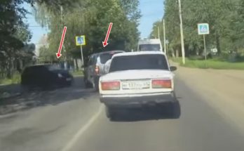Chevrolet Ņiva, kas apdzen vairākus transportlīdzekļus pēc kārtas, saduras ar Daewoo Matiz (no 0:20).