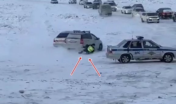 Aculiecinieka uzņemtajā video redzams, kā policija veltīgi cenšas aizturēt kaut vienu no desmitiem autovadītāju, kas šķērso vēl īsti neaizsalušo Ļenas upi Jakutijā pa stihiski izveidoto ledus pārceltuvi.