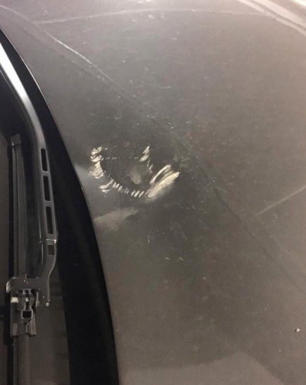 Kaimiņa automašīnai izsists aizmugurējais stikls, kā arī apskādēta transportlīdzekļa virsma, liecina sociālajā tīklā “facebook.com” publicētās fotogrāfijas.