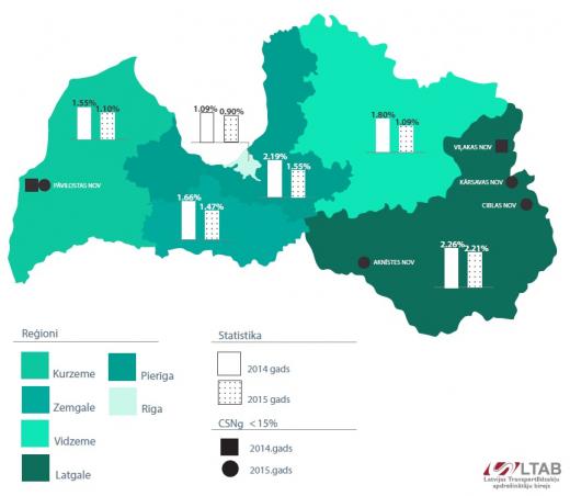 2015.gadā starp Latvijas kultūrvēsturiskajiem reģioniem proporcionāli lielākais CSNg skaits, ko izraisījis neapdrošināts auto, bijis Latgalē – 2,21% no visiem negadījumiem, bet starp novadiem – Ciblas novads, kur katrs trešais CSNg pērn izraisīts ar neapdrošinātu transportlīdzekli.