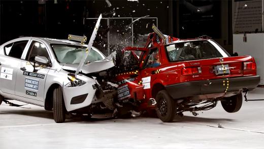 Video patiešām uzskatāmi redzams, cik 25 gadus vecā Nissan virsbūve ir neizturīga, kā trieciena rezultātā tā salokas un deformējas, iespiežot vadītāju, kamēr jaunā “Nissan” salons praktiski paliek bez izmaiņām.