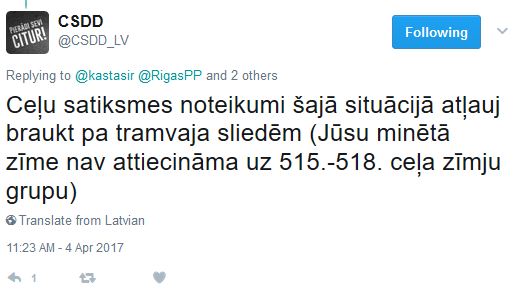 Par šo situāciju pretrunīgu informāciju sniedz Rīgas pašvaldības policija un CSDD. Policija sociālajos tīklos pauž viedokli, ka minēto krustojumu pa sliedēm nedrīkst šķērsot, attiecīgo zīmi uzskatot par 513.-518. grupas ceļa zīmi. Savukārt CSDD norāda, ka pa sliedēm krustojumu drīkst šķērsot, jo zīme nav saistāma ar iepriekšminētās grupas ceļa zīmēm.