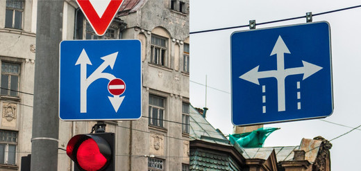 Bet vai krustojumā uzstādītā zīme tiešām aizliedz braukt pa tramvaja sliedēm? Kā redzams attēlā, konkrētā zīme uz Miera ielas atšķiras no tām, kas regulē braukšanas virzienus joslās tālāk, Matīsa un Tērbatas, kā arī Matīsa un Kr. Barona ielu krustojumos – tur nepārprotami ir uzstādītas 513.-518. grupas ceļa zīmes.